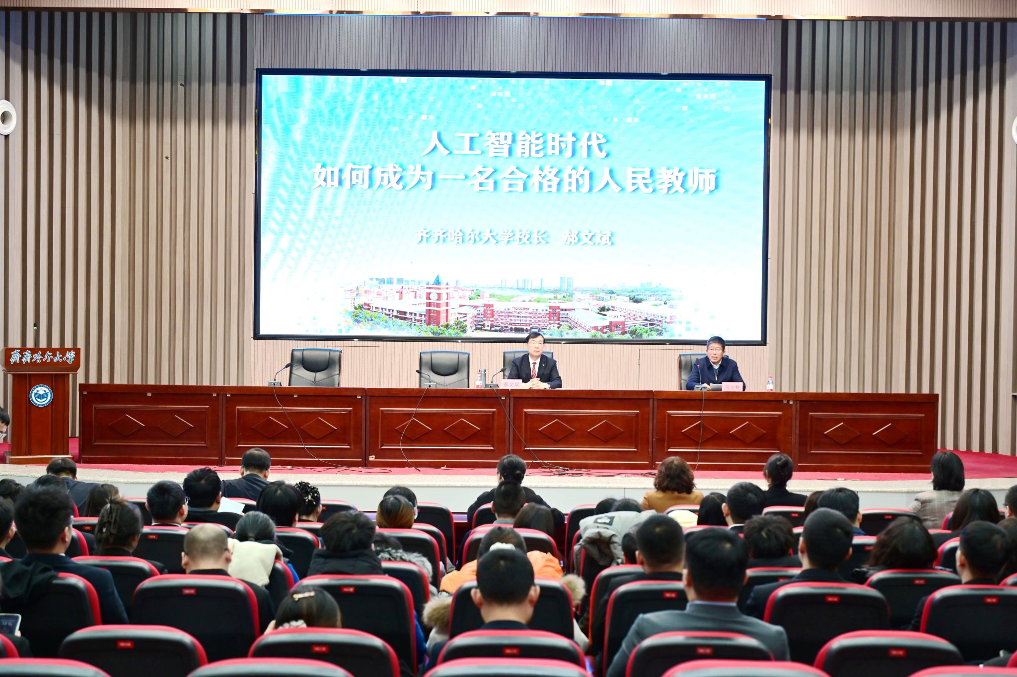 12月24日下午,2025年新教师入职培训第一讲在学校日新大厦四楼报告厅举行。校长郝文斌以“人工智能时代,如何成为一名合格的人民教师”为题为新入职教师作专题辅导。2025年全体新入职教师参加了培训,培训由副校长马文辉主持。