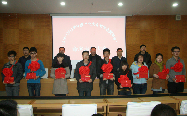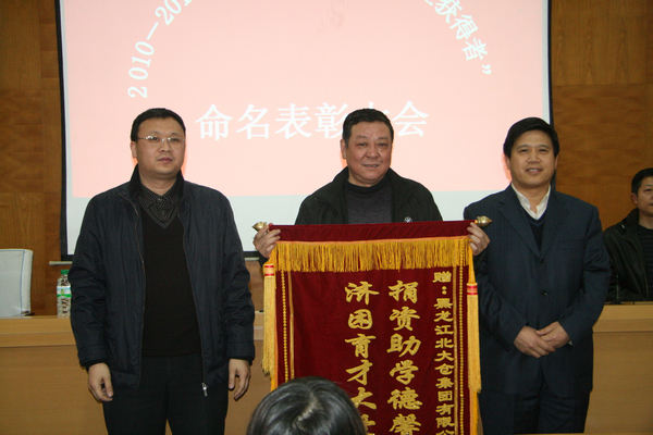 会上,副校长郑喜群、团市委副书记张兴永代表获得奖学金的学生向北大仓集团赠送了锦旗。我校2010-2011学年度“北大仓奖学金”获得者受到表彰和奖励。