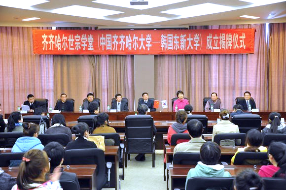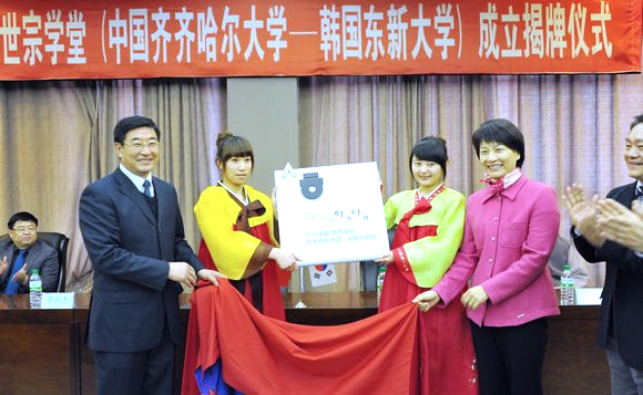 经我校与韩国东新大学积极申请、精心筹备,“齐齐哈尔世宗学堂”于4月9日正式落户我校,上午10时在德润大厦四楼会议厅举行了隆重的成立揭牌仪式。