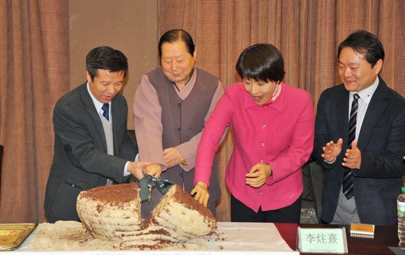 最后,副校长李英杰与韩国嘉宾一起切开了象征着喜庆、光明的年糕。全体参加揭牌仪式的领导、嘉宾一起分享年糕并合影留念。