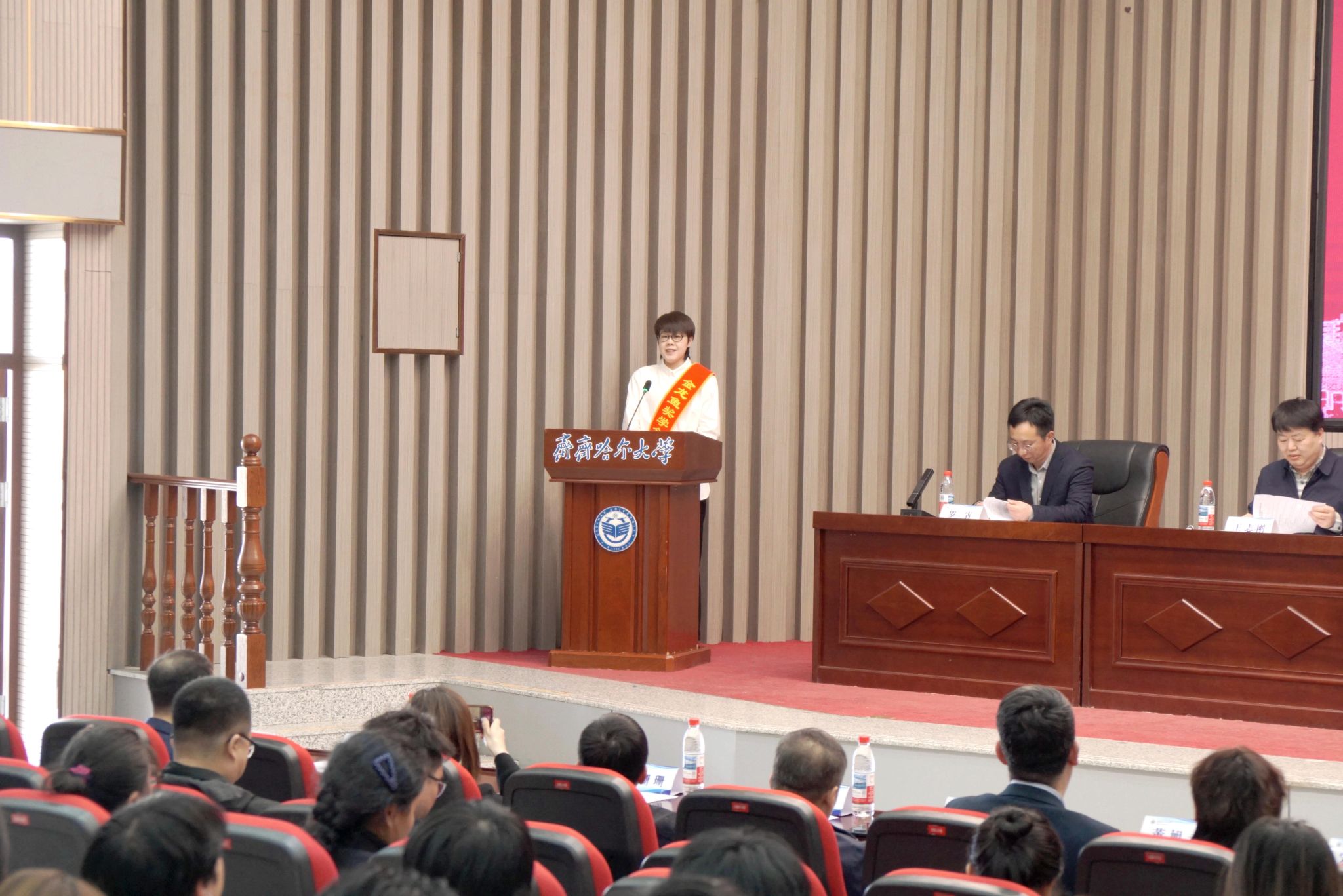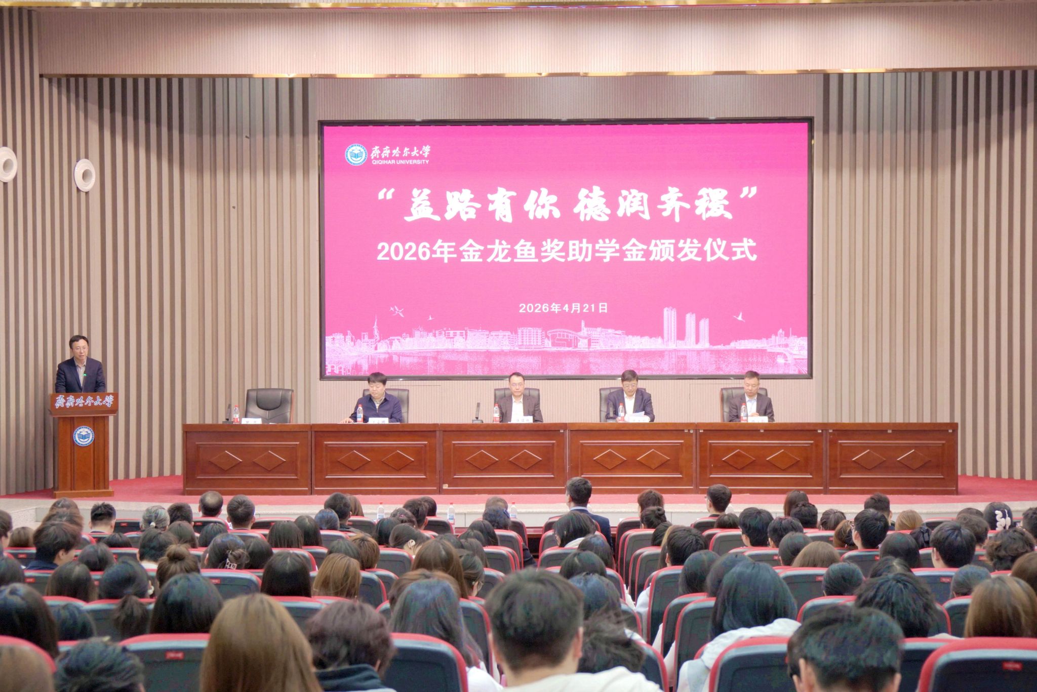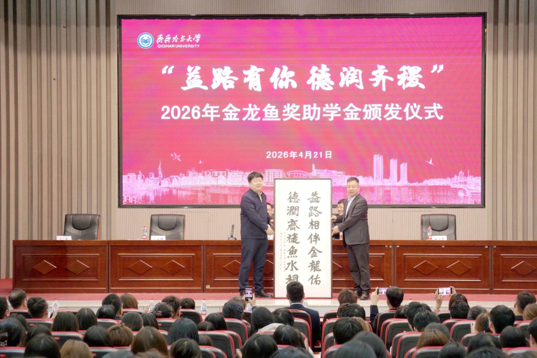 4月21日,齐齐哈尔大学2026年“益路有你,德润齐稷”金龙鱼奖助学金颁发仪式于日新大厦四楼报告厅举行。益海嘉里集团领导、校领导、获奖受助学生代表及相关部门和各学院师生齐聚一堂,共同见证爱心善举的传递与立德树人的丰硕成果。