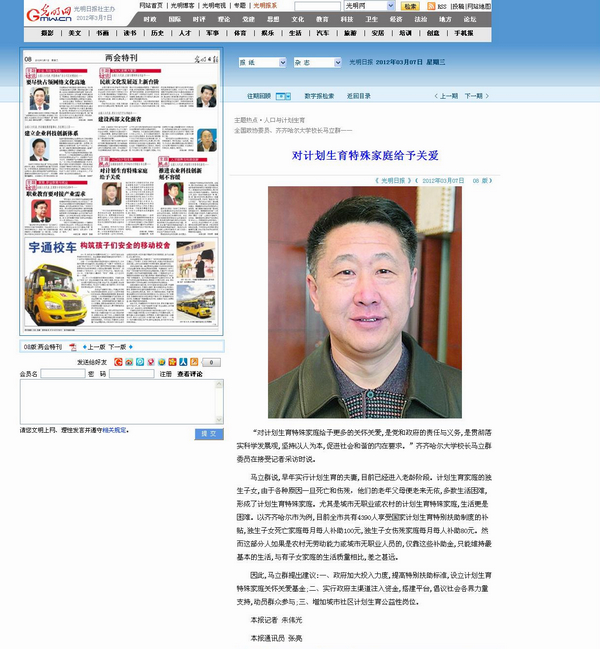 2012年3月7日出版的《光明日报》(08 版)的“两会特刊”的“主题热点·人口与计划生育”栏目刊发了题为“全国政协委员、齐齐哈尔大学校长马立群——对计划生育特殊家庭给予关爱”的图文报道。