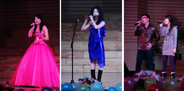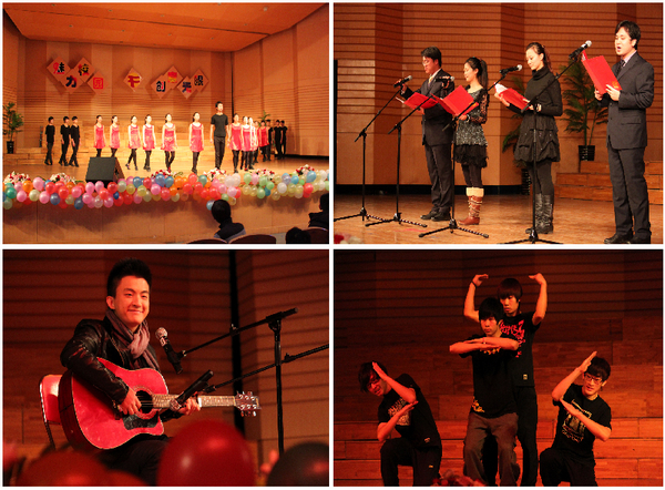 18:30,在典雅的音乐厅里,电子显示屏上传来了研究生会各部门全体同学的新年祝福话,伴随着倒计时,青春欢快的舞蹈《大河之舞》拉开了晚会的序幕。各专业研究生代表表演了15个精彩节目,涵盖了舞蹈、独唱、相声、诗朗诵、时装秀、乐器演奏、歌曲串烧、小品等多种艺术形式,亮点不断。