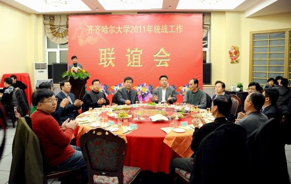马立群校长代表学校向出席此次联谊会的市委统战部、各民主党派市委、市侨联的领导表示热烈的欢迎,向我校的全国和省市区政协委员、各民主党派、统一战线的各界朋友以及各基层党组织、机关各部门的同志致以节日的问候,他在以感谢、发展、和谐为关键词的简短祝辞中,号召全校统一战线的朋友们、全校教职员工积极投身到高水平大学建设中来,为创造齐齐哈尔大学更美好的明天而努力奋斗,并衷心祝愿我党的多党合作事业取得更大的业绩,祝愿同志们、朋友们阖家幸福,吉祥安康,万事顺遂。