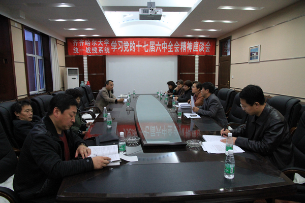 按照学校党委《关于学习贯彻党的十七届六中全会精神的通知》要求,2011年11月3日下午,校党委统战部在机关楼504会议室召开统战系统学习党的十七届六中全会精神座谈会。