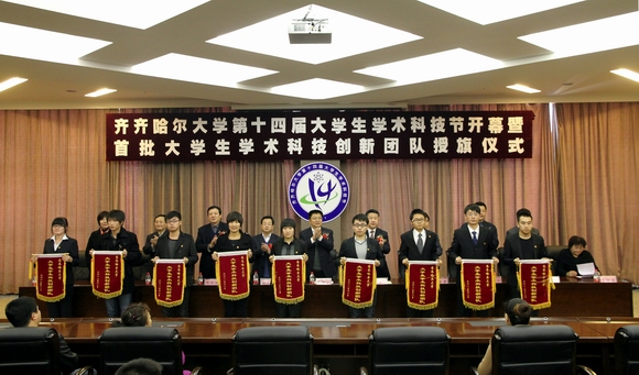 本届科技节组委会副主任、学工(部)处处长黄伟中宣读了《齐齐哈尔大学第十四届大学生学术科技节实施方案》。本届科技节组委会成员、“挑战杯”等校内竞赛主办单位负责人、实践教学与设备管理处处长张德庆宣读了学校《首批大学生学术科技创新团队名单》。与会领导为首批大学生学术科技创新团队授了旗。组建首批大学生学术科技创新团队和依托各学科专业开展各项学术科技竞赛是本届大学生学术科技节的一大特色和亮点,将为我校大学生学术科技竞赛活动注入新的活力。