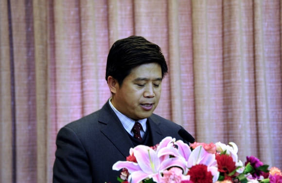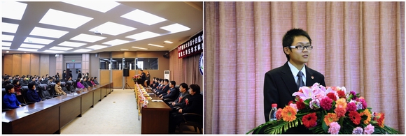 第十二届“挑战杯”全国大学生课外学术科技作品竞赛三等奖获奖学生、学校首批大学生学术科技创新团队代表、校学生会副主席、食品与生物工程学院09级学生肖振天同学代表全校学生做了发言。他表示在今后的科技创新实践中,继续发扬艰苦奋斗、严谨求实的精神,多出好作品,为我校青年学生树立良好的榜样,为母校增光添彩。