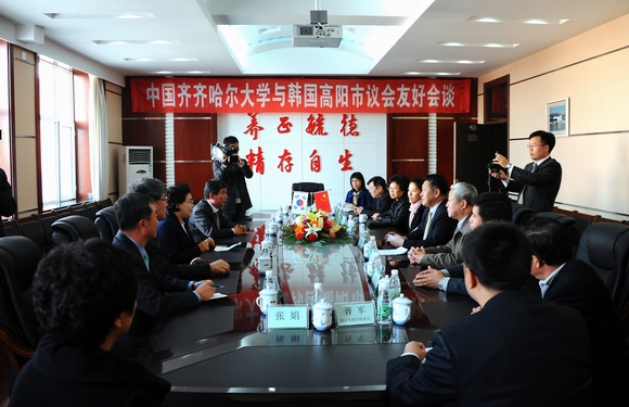 马立群校长对金毕礼议长一行的来访表示热烈欢迎,他向来宾详细介绍了我校教育教学的发展情况以及同韩国尤其是高阳市的教育界开展教育合作的相关情况。他说,齐齐哈尔市和高阳市是友好合作城市,此次高阳市议会代表团的到来,必将进一步增进两所城市之间的友谊,促进包括教育在内的各个领域的活动的开展,他希望通过双方高校间的合作共同打造中韩友谊的桥梁,为两国留学生创造更多的互相学习的机会,促进双方教育合作的深入开展。