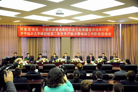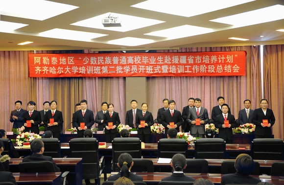 10月25日下午,新疆阿勒泰地区“少数民族普通高校毕业生赴援疆省市培养计划”齐齐哈尔大学培训班第二批学员开班式暨培训工作阶段总结会,在我校德润大厦四楼会议室隆重举行。自此,阿勒泰地区第二批21名参训学员正式开始了他们在我校的学习生活。