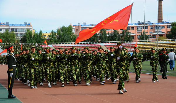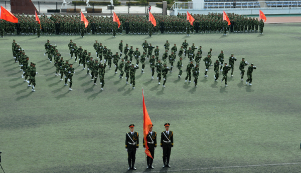 伴着雄壮的《解放军进行曲》,在军训教官的引领下,参加本次军训的2011级全体学生列成整齐威武的方阵,展示着飒爽的英姿。