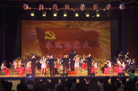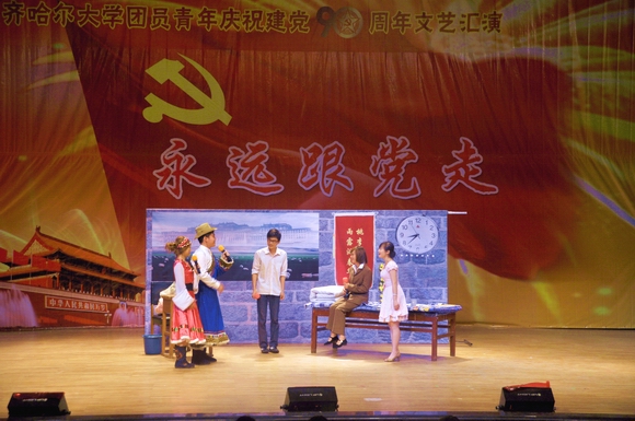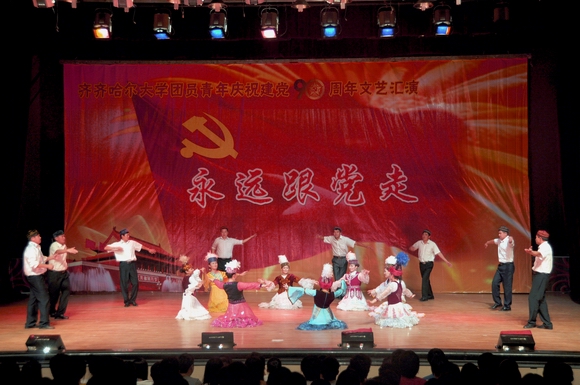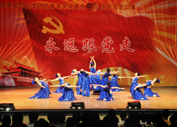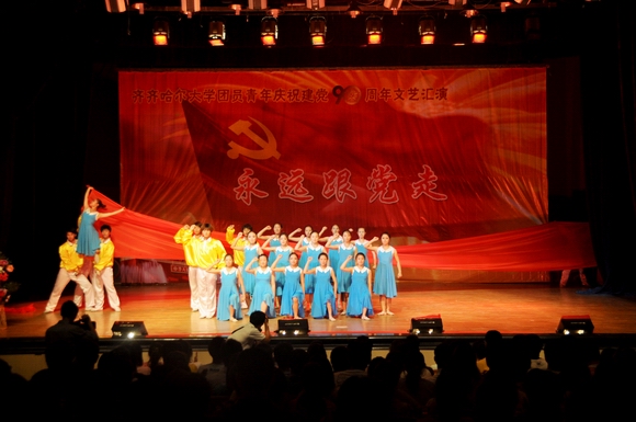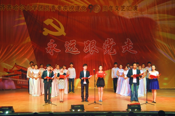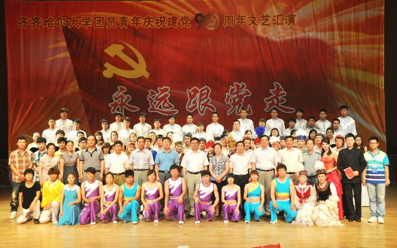 盛夏的鹤城大地,燃情似火,热烈奔放;美丽的齐大校园,青春如歌,华章奏响。在我校师生着力建设高水平大学、深入开展创新争优活动之际,我们迎来党的九十岁生日。6月22日下午14:00,由校团委主办、校学生会承办的齐齐哈尔大学团员青年庆祝建党90周年“永远跟党走”文艺汇演在中区文化宫隆重举行。学校党委书记李海红,校长马立群,党委副书记王凤琴、盖元臣、副校长姜守训、郑喜群、邓启刚、王刚,工会主席吕晓辉以及党办校办、党委宣传部、校工会、校团委、学生工作处、新闻中心等相关职能部门的领导老师与1400余名学生一同观看了文艺演出。