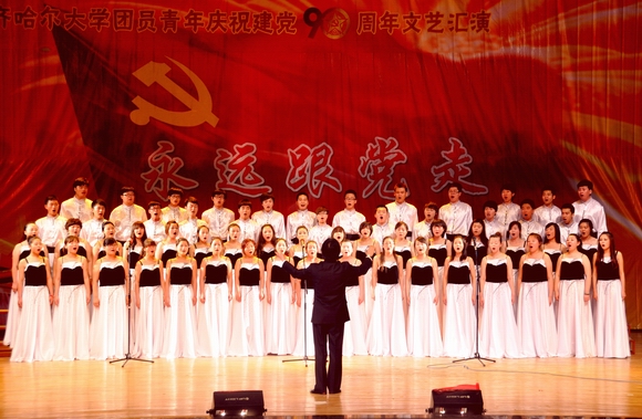 整台演出分为“红船领航程”、“灿烂阳光下”和“永远跟党走”三个篇章,内容丰富、特色鲜明、异彩纷呈。师生们通过歌曲、舞蹈、器乐、校园情景剧、诗朗诵、大合唱等,回顾了党的90载风雨征程,热情讴歌党的丰功伟绩。特别是原创诗朗诵《我们的称号》,用雄浑高亢的声音吟诵出全校团员青年对母校的热爱和赞美;外籍留学生演唱的小合唱《明天会更好》,表达了不同种族、不同民族青年“同一个世界、同一个梦想”的共同心愿;继续教育学院新疆班的民族舞蹈《故乡的思念》,表达了五十六个民族血脉相连、携手并肩走向灿烂辉煌的美好祝愿;反映大学生毕业生援藏题材的校园情景剧《雪域的守候》,表现了齐大学子以振兴中华为己任、以祖国繁荣昌盛为理想,甘于奉献的优秀品质,志存高远、建设边疆的高尚情操,为党和人民建功立业的壮志豪情。演员们的精彩表演深深打动了现场的每一位观众,现场时而寂然无声,时而热烈沸腾,雷鸣般的掌声一次次在剧场里响起。最后,演出在大合唱《怒吼吧黄河》中落下帷幕。演出结束后,与会领导走上舞台,同全体演职人员亲切握手,并合影留念。