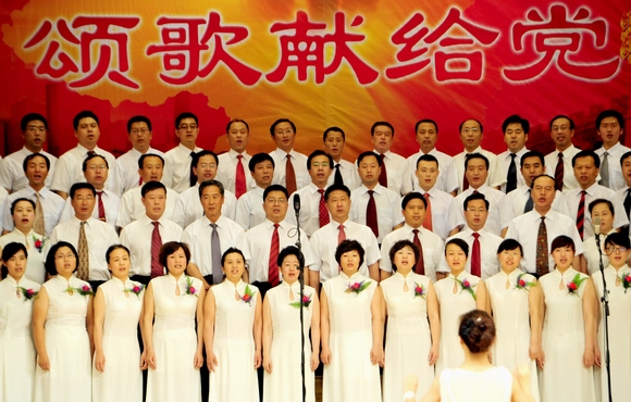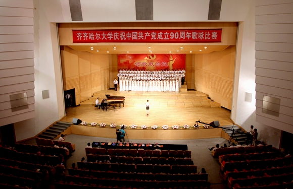 红歌献给党,激情先锋颂。2011年6月28日下午,“齐齐哈尔大学纪念建党90周年‘颂歌献给党’师生大合唱比赛”在音乐厅隆重举行。校领导李海红、马立群、王凤琴、盖元臣、张学军、姜守训、郑喜群、王刚、吕晓辉等走上舞台与机关合唱表演队一起合唱《中国中国 鲜红的太阳永不落》、《我们走在大路上》等曲目,并与1200余名师生一同观看比赛,共庆建党90周年。