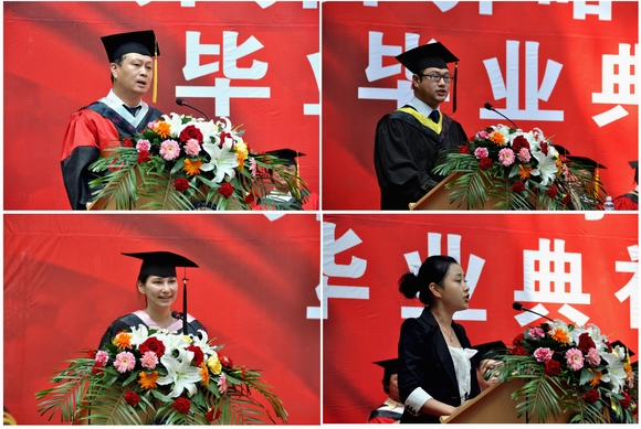 毕业生代表—省优秀学生干部、校学生会主席于雷、留学生代表—国际交流学院国际交流学院玛丽娅、在校生代表—文学与历史文化学院学生会主席朱伟红、教师代表—经济管理学院院长王维教授先后在毕业典礼上发言。他们祝贺2011届学生顺利毕业并荣获学位,祝愿伟大的党永葆青春,祝愿祖国繁荣昌盛,祝福母校再创辉煌。