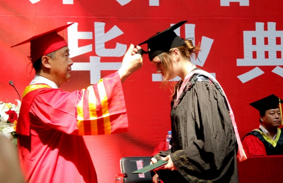 校长马立群教授一一为获得学位的毕业生代表正冠拨苏,颁发学位证书并合影留念。全场师生报以热烈的掌声向他们表示热烈祝贺!