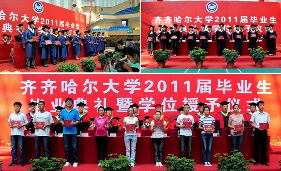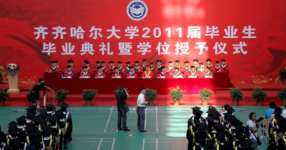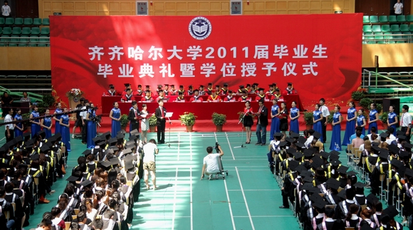 仲夏七月,“环湖大学”又一次演绎感动15万名校友心灵的毕业经典。在纪念建党90周年的喜庆时刻,在高水平大学建设全面推进之时,我校2011届毕业生圆满完成学业,即将开启人生新的征程。6月29日上午,“齐齐哈尔大学2011届学生毕业典礼暨学位授予仪式”在体育馆隆重举行。