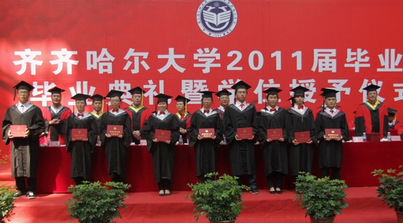 副校长姜守训主持毕业典礼。副校长、校学位评定委员会副主任郑喜群宣读齐齐哈尔大学《关于准予研究生,留学生,本、专科学生毕业的决定》;副校长、校学位评定委员会副主任邓启刚教授宣读齐齐哈尔大学《关于授予研究生,留学生,本科学生学位的决定》;副校长王刚宣读黑龙江省教育厅《关于表彰2011黑龙江省优秀毕业生的决定》、齐齐哈尔大学《关于命名表彰2011届优秀毕业生的决定》。
