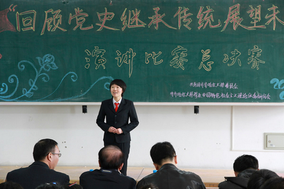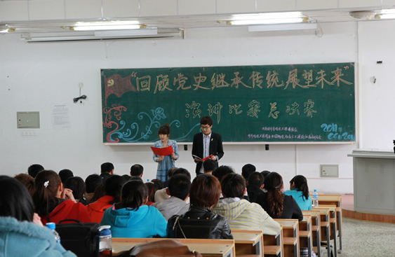 为热烈庆祝中国共产党成立90周年,在广大青年学生中营造“学党史,知党情,永远跟党走,争做新一代”的浓厚氛围,教育引导广大团员青年进一步坚定走中国特色社会主义道路的理想信念,根据省、市“关于庆祝建党90周年”相关文件精神要求,按照我校团委“学党史、知党情、跟党走”主题教育活动的整体安排和部署,4月20日下午,我校“回顾党史 继承传统 展望未来”主题演讲比赛校级决赛在西主阶教203举行。