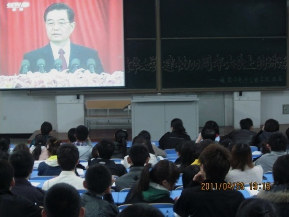 通信与电子工程学院团委于4月26日晚7点在中主J301室组织该院广大学生共同观看了“胡锦涛总书记在庆祝清华大学建校100周年大会上的讲话”直播视频。广大学生一致表示,胡锦涛总书记庆祝清华大学建校100周年大会上发表的重要讲话,不仅是对清华学子给予的谆谆寄语,也是对全国青年学生提出的三点希望。讲话高屋建瓴,内涵深刻,意义深远,鼓舞人心,集中体现了党和政府对高等教育事业的高度重视,对青年学生和广大教师的亲切关怀。我们一定要深刻领会精神实质,认真实践,努力成为可堪大用、能负重任的栋梁之才。
