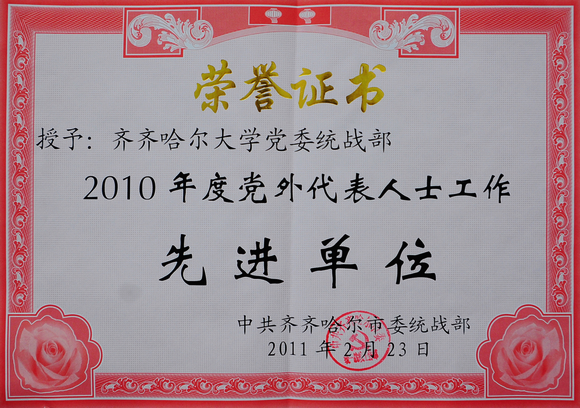 2月24日下午,2011年全市统战部长会议在市党政机关办公中心召开。会议传达了全国、全省统战部长会议精神,表彰了2010年度统战工作先进单位和先进个人。我校党委统战部被市委统战部授予“2010年度党外代表人士工作先进单位”荣誉称号。这是继2010年我校九三学社齐大支社被评为“省级先进基层组织”、校侨联被授予市“侨联工作先进集体”、《黑龙江统一战线》、《中国统一战线》大篇幅报道我校统战工作之后,我校统战工作取得的又一新荣誉。