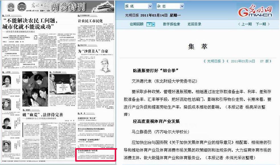3月14日,《光明日报》两会特刊专栏刊发了记者朱伟光采写的全国政协委员、齐齐哈尔大学校长马立群的建议《应高度重视体育产业发展》。马立群委员建议:应加快出台与国务院《关于加快发展体育产业的指导意见》相配套、相衔接的引导和推动体育产业及体育消费市场发展的政策细则和法规条例。大力培育体育市场的消费主体,做大做强体育产业和体育服务业。