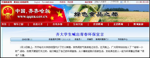 2011年3月24日,黑龙江省高校后勤管理指导中心、黑龙江省教育后勤管理协会向各普通高等学校、广大师生员工发出《2011年“地球一小时”活动倡议书》。