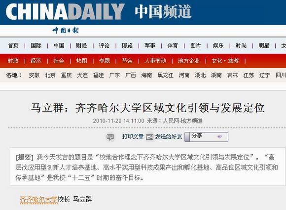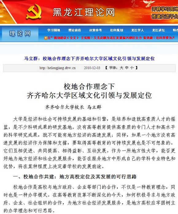 12月3日,由黑龙江省委宣传部主办的“黑龙江理论网”的“理论前沿”以《校地合作理念下齐齐哈尔大学区域文化引领与发展定位》发表了马立群校长的署名文章,在理论界与高教界产生了广泛而积极的反响。