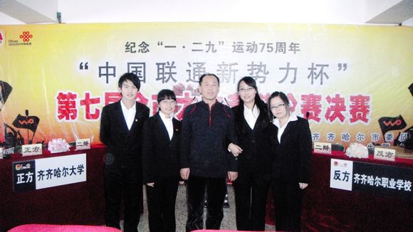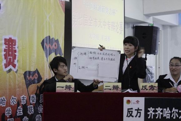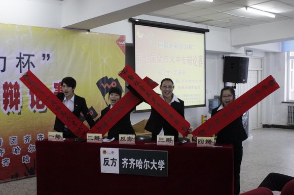 本届大中专辩论赛于11月19日开赛,全市9所大中专院校参加,分大学和中专2个组别。经过初赛、复赛,我校代表队分别淘汰了齐齐哈尔医学院代表队和齐齐哈尔高等师范专科学校代表队,顺利晋级决赛。