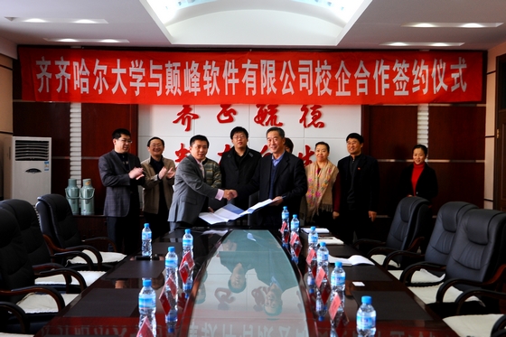 在热烈的气氛中,我校副校长姜守训代表学校与颠峰国际软件集团总裁吴剑正式签署了校企合作协议。