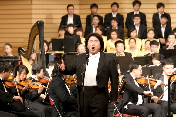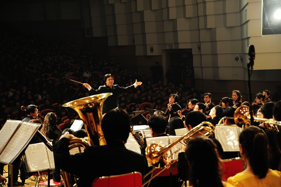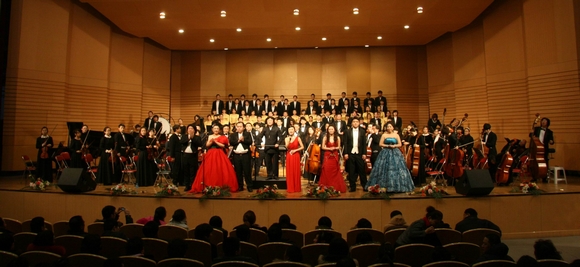 随着演出总指挥、我校音乐与舞蹈学院院长、国家级著名音乐指挥家孙相根教授刚劲有力的手势,音乐会在宏大的《红旗颂》中拉开了的序幕。