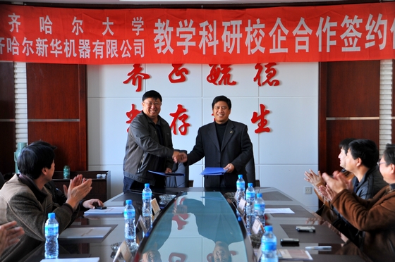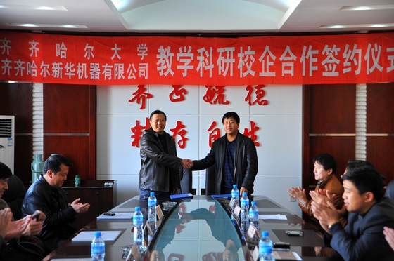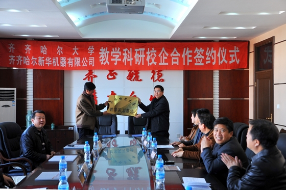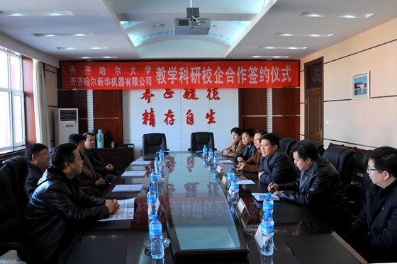 11月10日上午,我校在中区行政楼504会议室召开会议,举行与齐齐哈尔新华机器有限公司教学科研校企合作签约仪式。副校长郑喜群,齐齐哈尔新华机器有限公司总经理王尔建,齐齐哈尔建华电梯有限公司总经理张晓丹,黑龙江北方汽车制动系统有限公司总经理刘景华等出席会议。我校实践教学与设备管理处副处长祝文生,科技处副处长伊全胜,机电工程学院党委书记王云鹏,机电工程学院常务副院长王世刚、巨勇智等学院领导及新华机器有限公司有关领导参加会议。