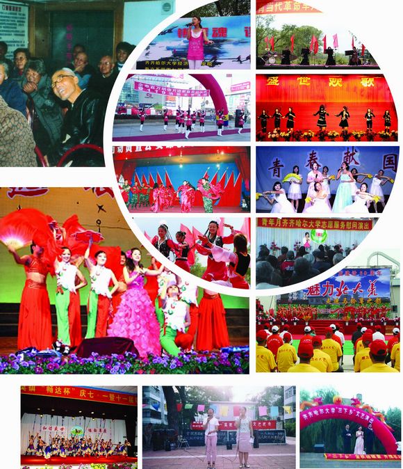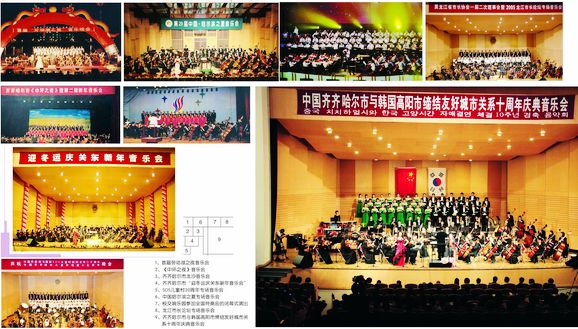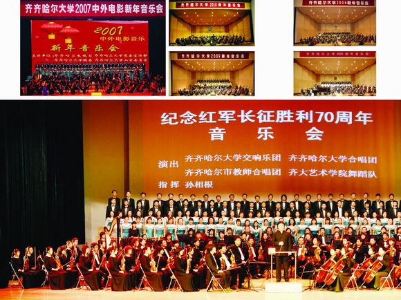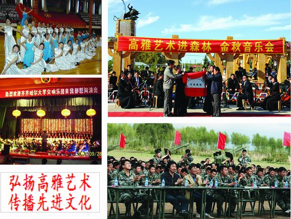 多年来,我校发挥交响乐团、师生合唱团等专业艺术团队的资源优势,去工厂、部队、企业还是农村,以“文化惠民工程”促进社会和谐,参加教育部高雅艺术进校园、绿博会、关东文化节、和平节、齐齐哈尔新年音乐会等演出180余场,承担群众文化展演任务300余场次,在弘扬高雅艺术中蜚声艺苑,香飘校园,辐射社会,成为我校文化校园的响亮品牌;举办5次中韩美术文化交流活动和两届中国亚麻服饰设计大赛暨国际现代设计专家论坛,主持设计了马恒昌主题公园、江桥抗战纪念馆中的“战迹沙盘”和“纪念壁画”,发挥音乐厅、美术馆、文化宫、体育馆等群众文化硬件资源优势,共承担群众文化展演任务300余场次,提升了本地区群众文化层次,树立了城市文化品牌形象,每一场演出都让现场的观众听者动容,大有“既去而余音绕梁,三日不绝”之感。学校真诚邀请了莫斯科柴可夫斯基音乐学院“泰斗级”人物、世界著名指挥大师波里斯?杰夫林教授、中国交响乐团联盟主席、中国音乐家协会交响乐爱好者学会副会长、中国电影音乐学会特约理事、国家一级指挥卞祖善、全国著名钢琴大师刘诗昆等大师,开展了广泛的高雅文化交流活动。充分发挥交响乐团、师生合唱团等专业艺术团队的群众文化软件资源优势,活跃丰富演出市场,在教育部高雅艺术进校园巡回演出、全国第四届特奥会、中国?哈尔滨第29届哈尔滨之夏音乐会、龙沙音乐会、劳动湖之夏音乐会、一年一度的绿色博览会、连续多年的齐齐哈尔新年音乐会、关东文化旅游节、赴黑龙江省农垦总局九三分局进行慰问演出、华安集团有限公司、大庆石化总厂、举办慰问驻齐部队官兵专场音乐会专场等演出达180余场。产生强烈反响,赢得了省教育厅的特别嘉奖。发挥音乐厅、文化宫、体育馆等群众文化硬件资源优势,共承担群众文化演出任务260余场次。经教育部审批,在2006年的“高雅艺术进校园”活动中,我校交响乐团将在我省各高校做巡回演出。黑龙江日报2006年6月11日在第一版以《高雅艺术打造一流名校 齐齐哈尔大学交响乐团发展启示录》为题做了专门的报道。