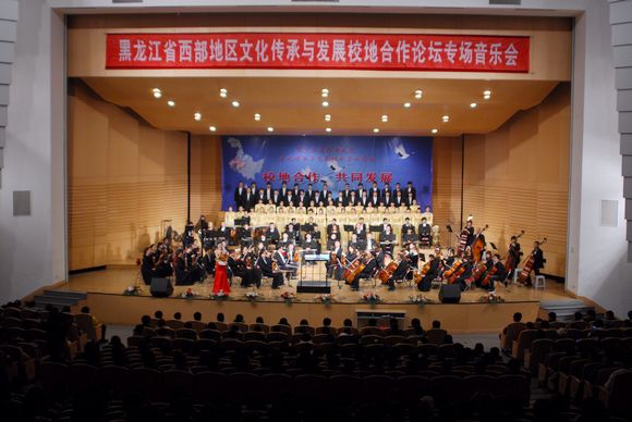 学校交响乐团为来校参加论坛的的省委宣传部、省委高校工委、省教育厅有关领导、齐齐哈尔市、大庆市、黑河市、绥化市、大兴安岭地区等黑龙江省西部地区五地市宣传部领导、十三所高校专家学者代表、企业界代表、新闻媒体记者、我校师生代表等1200余人再次奏响气势宏大的钢琴协奏曲《黄河》第四乐章、《红旗颂》等经典曲目。这是我校弘扬高雅艺术、传播先进文化的缩影。