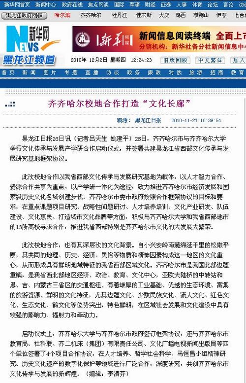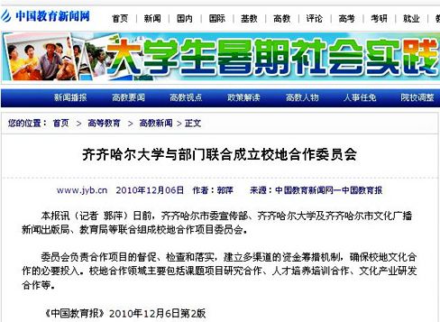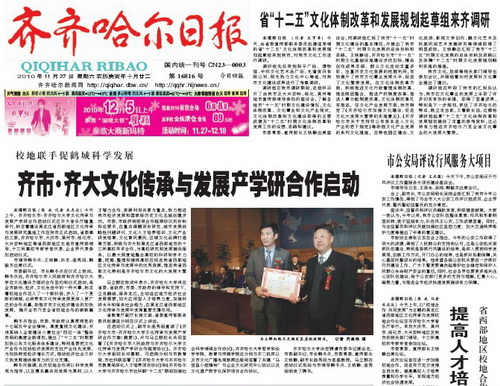2010年12月6日,《中国教育报》第2版以《齐齐哈尔大学与部门联合成立校地合作委员会》为题,对我校与齐齐哈尔市校地合作工作启动进行热忱报道,标志着我校与齐市文化传承与发展产学研合作工作蜚声全国。