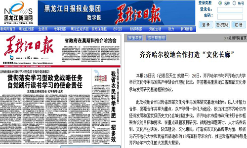 在校地合作启动仪式暨论坛举行前夕,《齐齐哈尔日报》和《鹤城晚报》分别了做了专题报道,为我校与齐齐哈尔市化传承与发展产学研合作启动仪式隆重举行营造了良好的舆论氛围。
