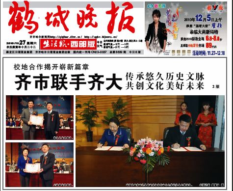 11月27日,《齐齐哈尔日报》第1版以分别以《校地联手 促鹤城科学发展 齐市·齐大文化传承与发展产学研合作启动》、《省西部地区校地合作论坛举行 提高人才培养质量 实现经济社会快速发展》为题,采用图文并茂的形式大篇幅报道了我校与齐齐哈尔市文化传承与发展产学研合作启动情况。2篇大幅专题报道占据了《齐齐哈尔日报》第一版的2/3版面,产生了积极而广泛的社会影响。