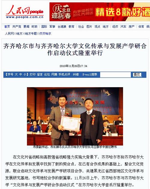 11月26日,齐齐哈尔新闻网以《文化传承与发展产学研合作启动》做了图文报道。