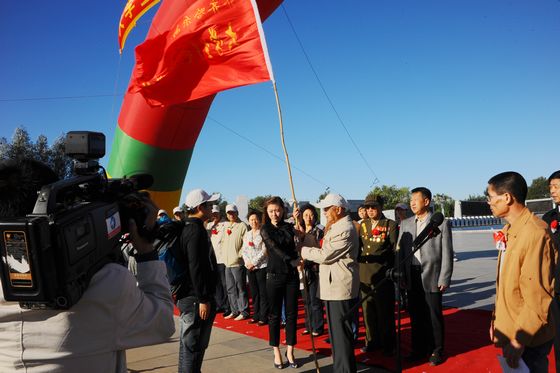 抗日老战士代表、齐齐哈尔市政协常委、黄埔军校同学会会长孟繁柏老人向重走抗战路大学生队伍授旗。