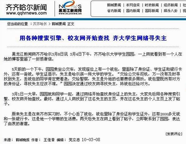 3月8日,《鹤城晚报》以《齐大学生网络寻失主》为题,对我校学生“园园”利用各种搜索引擎、校友网查找失主、迅即归还失主遗失财物的拾金不昧行为予以热忱报道和赞誉,东北网·齐齐哈尔频道、齐齐哈尔新闻网等网络媒体予以积极转载,为学校赢得了良好的社会声誉。