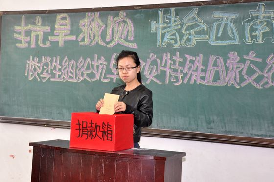 外国语学院团员青年用心与心的相连凝聚成甘霖支援西南旱区,共捐资8753.20元,其中日语092班吴金羽同学拿出了100元生活费捐给了灾区。她说“祖国人民亲如一家,希望用自己的捐助贡献出一点微薄之力。”