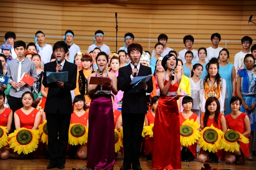 文艺汇演由“如歌岁月、盛世华章、辉煌中国”三个篇章组成,第一篇章的大合唱《祖国,慈祥额母亲》、《保卫黄河》和配乐诗朗诵《我爱祖国》等文艺节目,见证了中华民族不屈的奋斗征程;第二篇章的歌曲《国家》、器乐合奏《流金岁月 》等节目,引领在场师生回顾共和国的风雨历程,讴歌我党带领全国人民进行改革开放的历史功勋,热情颂扬新中国成立60年来所取得的伟大成就;第三篇章的歌舞《中国新世纪》将整场演出推向高潮,同学们载歌载舞,淋漓尽致地用歌舞表达对伟大祖国的祝福,表达了当代大学生牢记青年的历史使命,信心百倍跟党走的信心和决心。