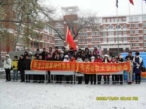 加强法制宣传教育,服务经济社会发展。为了贯彻党的十七届四中全会精神,大力宣传新中国成立60年来社会主义法制建设的巨大成就,推进“五五”普法规划的全面落实。12月4日,在校党委宣传部、校团委的支持下,齐齐哈尔法学会会长吕途教授带领法学会几十名会员与黑龙江省铭昊师事务所合作进行了一次规模较大的普法宣传活动,收到了良好的效果。