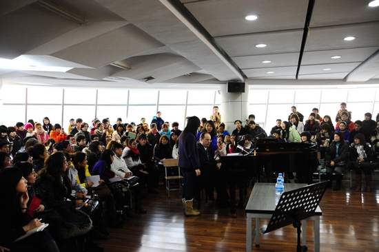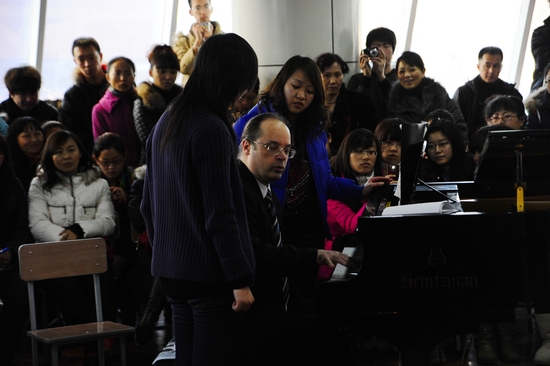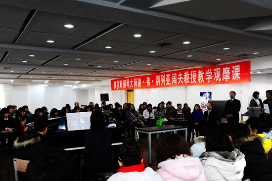 开班式上,我校外事处副处长、国际交流学院副院长郭寒竹致欢迎词,艺术学院副院长孙相根对本次大师班的相关情况作了详细介绍。俄罗斯钢琴大师谢•弗•别列亚阔夫教授同现场师生代表进行了亲切交流,并主持讲授了第一次现场教学观摩课。