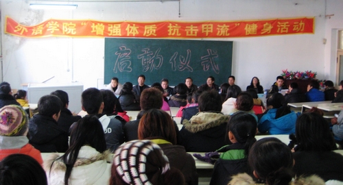 在该项活动启动仪式上,外国语学院副书记、副院长杨国志宣读了此次活动的方案,重申了运动健身竞赛活动的意义与目的,向全院同学发出了“增强体质,抗击甲流”号召,希望同学们在运动健身中增强体质,在体育竞赛中增进友谊,在文化娱乐活动中养成文明健康的生活方式,以实际行动促进我校“三型校园'建设。外国语学院英语081班学生张丹丹代表该院2000名学生做了表态发言。