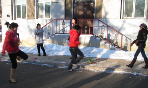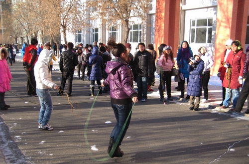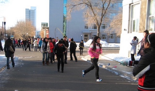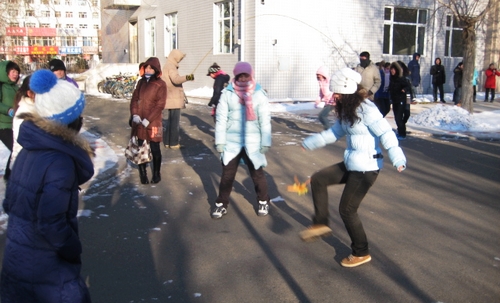 “大学生冬季课外活动竞赛暨‘增强体质、抗击甲流’活动启动仪式”结束后,外国语学院学生以班级为单位展开了竞赛活动。比赛分单人跳绳、集体跳绳和集体踢毽子等项目。虽然室外温度达到了零下二十几度,但同学们的比赛热情非常高,有的摘掉了帽子、手套,甚至有的同学在运动中脱掉了厚厚的羽绒服。