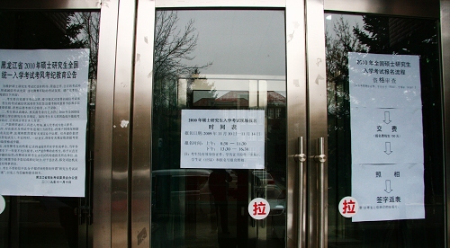 在东区学生指导中心一楼大厅,在大厅入口的大门上,粘贴着“2010年全国硕士研究生入学考试报名流程”、“2010年全国硕士研究生入学考试现场报名时间表”和“黑龙江省2010年硕士研究生全国统一入学考试考风考纪教育公告”等公告信息,前来报名现场确认的考生在大厅入门处即可看见。
