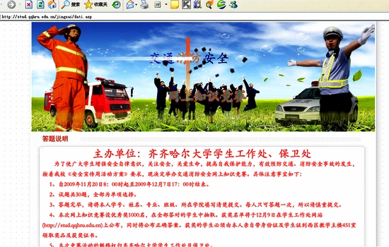 此次“大学生交通、消防安全网上知识竞赛”自2009年11月20日早8:00时启动,至2009年12月7日晚17:00时结束。在此阶段任一时间,学生可以登录学生工作处网站(http://stud.qqhru.edu.cn)答题。