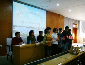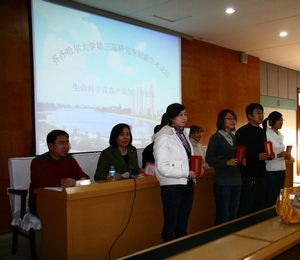 在此次创新论坛上,生命科学与工程学院各专业的硕士生导师为与会人员做了精彩的学术报告。刘晓兰教授做了题为《微生物纤溶酶研究进展》的学术报告,重点阐述了纤溶酶在急性心肌梗死等血栓栓塞性疾病的应用前景和研究进展。郭成宇教授做了题为《植物蛋白饮料市场发展分析与新产品开发》的学术报告,重点阐述了传统饮料食品的精加工和新产品的开发。孙剑秋教授做了题为《内生真菌:生物活性物质的工厂!》的学术报告,阐述了内生真菌的益处及研究进展。部分获奖研究生就自己的研究进展分别做了《毛尖紫萼藓干旱胁迫cDNA文库的构建》、《重金属离子对荇菜根茎生理指标的影响》、《毛尖紫萼藓复水cDNA文库的构建》、《蛹虫草原生质体紫外诱变选育胞外多糖高产菌株》、《正交设计法优化三岛柴胡愈伤组织培养基》、《玉米胚芽蛋白的分离及特性研究》的大会发言,向参加论坛的导师和同学们汇报了自己研究的创新点和工作进展。