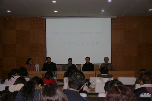 11月24日14:30,由人文学院承办的“人文科学与社会进步” 分论坛在西主学术报告厅举行。校研究生处副处长滕永富、社科部主任何春歧、人文学院党委书记卜春江、人文学院院长王则远、哲学与社会工作学系主任王树松、历史系主任周彦及部分硕士生导师、人文学科的硕士研究生、本科生代表等150余人参加了此次论坛。人文学院副院长邢丽雅教授主持了本届研究生创新论坛。