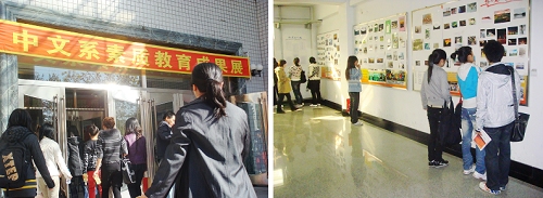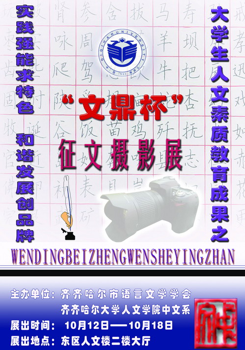 讴歌盛世显才艺,书写豪情绘宏图。10月15日,人文学院中文系与齐齐哈尔市语言文学学会为贺新中国60华诞,展示汉语言文学专业学生人文素质教育成果,增强广大学生的艺术修养,展现当代大学生的精神风貌,在人文楼二楼大厅举办了人文素质成果展之“庆国庆‘文鼎杯’征文、摄影展”。
